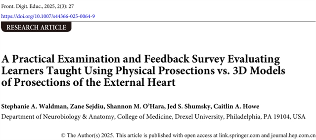 近日,美国德雷塞尔大学Stephanie A. Waldman等在Frontiers of Digital Education(《数字教育前沿(英文)》)期刊上发表了一篇题为A Practical Examination and Feedback Survey Evaluating Learners Taught Using Physical Prosections vs. 3D Models of Prosections of the External Heart (《实体断层标本与虚拟 3D 断层模型在心脏解剖教学中的实践评估与反馈调查》)的文章,通过一项针对29名医学新生的对比研究,探讨了实体心脏断层标本与虚拟3D心脏断层模型在教学效果上的差异,同时调查了学生对两种教学资源的偏好,为解剖学教学中虚拟资源的合理应用提供了实证依据。