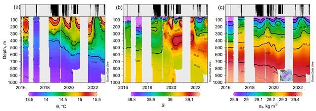 图2:阿索斯盆地 2016 年 1 月至 2022 年 12 月期间的位温  (a)、盐度 S (b) 和位密度  (c)的时间-深度图。图中上方的黑点代表时间-深度数据分布。