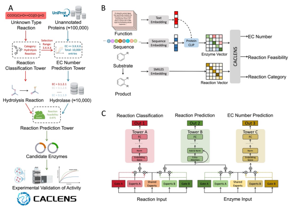 近年来,深度学习在酶的结构、功能与性质的大规模预测方面取得了进展。然而,由于缺乏面向多模态输入和多任务输出的统一建模能力,现有方法难以满足高性能功能酶筛选的需求。针对这一挑战,研究团队设计并开发了CACLENS框架,将CGC门控机制、对比学习与交叉注意力等方法深度融合,构建出可同时执行多项预测任务的一体化酶筛选平台。