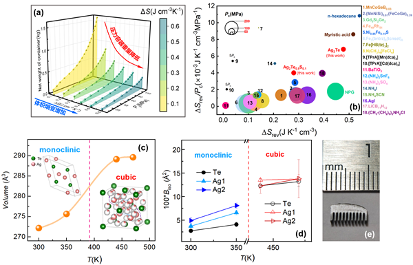科研人员研发了新型高密度Ag2Te1-xSx材料。研究发现,该材料在仅70 MPa的中等驱动压力下,实现了0.478 J·cm-3·K-1的可逆体积熵变,刷新了当前无机压卡材料的最高纪录。其压卡强度达6.82 mJ·cm-3·K-1·MPa-1,高于已报道的无机压卡材料,甚至优于新戊二醇等经典的有机庞压卡材料。
