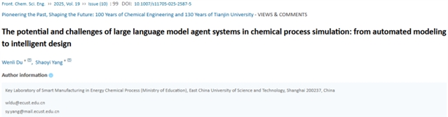 Wenli Du, Shaoyi Yang. The potential and challenges of large language model agent systems in chemical process simulation: from automated modeling to intelligent design. Front. Chem. Sci. Eng., 2025, 19(10): 99 DOI:10.1007/s11705-025-2587-5