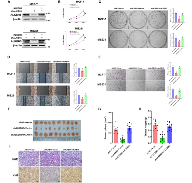 研究团队首先通过生物信息学分析发现,ALKBH5在乳腺癌中高表达且与患者不良预后相关。为验证其功能,团队在乳腺癌细胞系MCF-7和MB231中敲低ALKBH5,结果显示细胞增殖速率显著降低,集落形成能力下降,同时细胞迁移与侵袭能力减弱(图1)。在裸鼠异种移植模型中,ALKBH5敲低的MCF-7细胞形成的肿瘤体积与重量均显著小于对照组,且肿瘤组织中增殖标志物Ki67的表达减少。这些结果表明,ALKBH5是乳腺癌细胞增殖与体内成瘤所必需的因子。