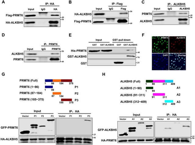 为探究ALKBH5的调控机制,研究团队通过质谱分析筛选ALKBH5的相互作用蛋白,发现PRMT6是潜在结合伴侣。进一步的实验证实,内源性及外源性PRMT6与ALKBH5均存在蛋白相互作用,GST pull-down实验则表明两者可直接结合,且共定位于细胞核(图2)。结构域分析显示,PRMT6的185-375位氨基酸片段是结合ALKBH5所必需的。