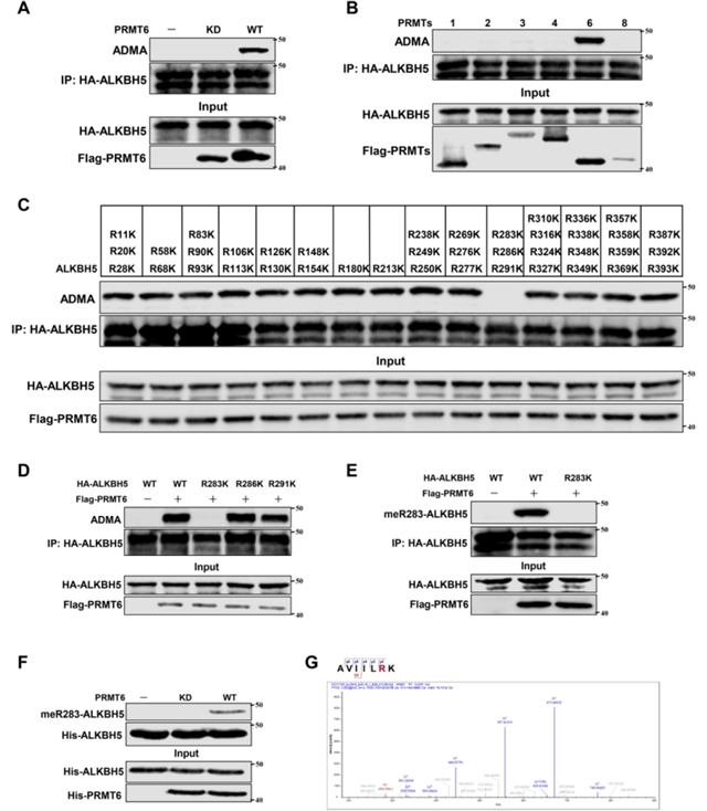 由于PRMT6具有精氨酸甲基转移酶活性,团队进一步检测其是否可甲基化ALKBH5。体外甲基化实验显示,野生型PRMT6可诱导ALKBH5的精氨酸甲基化,而酶活性失活突变体则无此作用,且其他I型PRMT家族成员均不能替代PRMT6的作用(图3)。通过对ALKBH5的精氨酸残基进行突变筛选,团队发现R283位点突变为赖氨酸(R283K)后,PRMT6介导的甲基化作用完全消失,质谱分析进一步证实R283是PRMT6的直接甲基化位点。