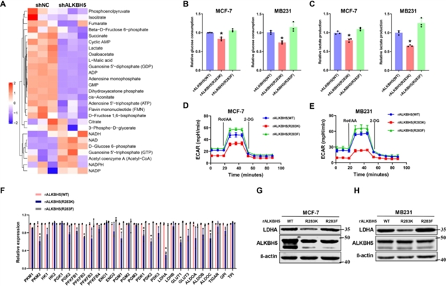 图4 ALKBH5 R283位点甲基化通过上调LDHA表达促进乳腺癌细胞糖酵解