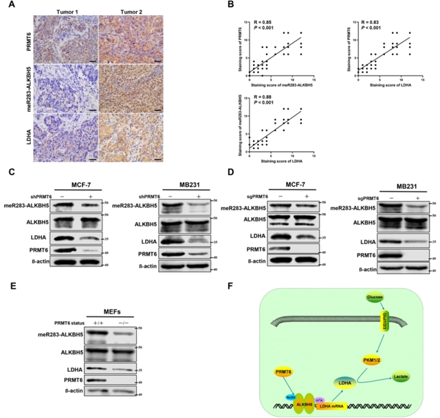 最后,研究团队对80例乳腺癌患者组织进行免疫组化分析,发现PRMT6、甲基化的ALKBH5(meR283-ALKBH5)及LDHA的表达水平均显著升高,且meR283-ALKBH5的表达与PRMT6、LDHA水平呈正相关(图7)。在乳腺癌细胞及PRMT6敲除小鼠胚胎成纤维细胞中,PRMT6缺失导致meR283-ALKBH5与LDHA表达均降低,提示临床样本中三者的表达水平受PRMT6-ALKBH5-LDHA信号轴调控。