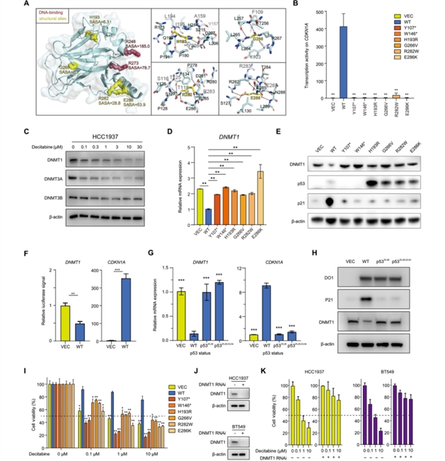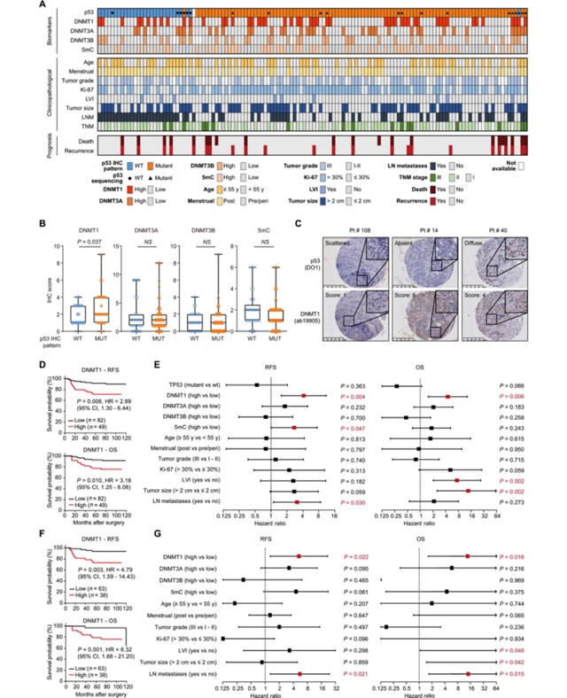 研究团队首先分析了132例I-III期三阴性乳腺癌患者的组织芯片,发现DNMT1过表达与p53突变显著相关,且DNMT1高表达患者的总生存期更短(图1)。通过免疫组化染色,p53突变型肿瘤的DNMT1表达水平显著高于野生型,而DNMT3A、DNMT3B和5-甲基胞嘧啶(5mC)水平无显著差异。多因素分析显示,DNMT1过表达是三阴性乳腺癌独立的不良预后因素,尤其在p53突变亚群中,高DNMT1表达与更差的无复发生存和总生存期相关。