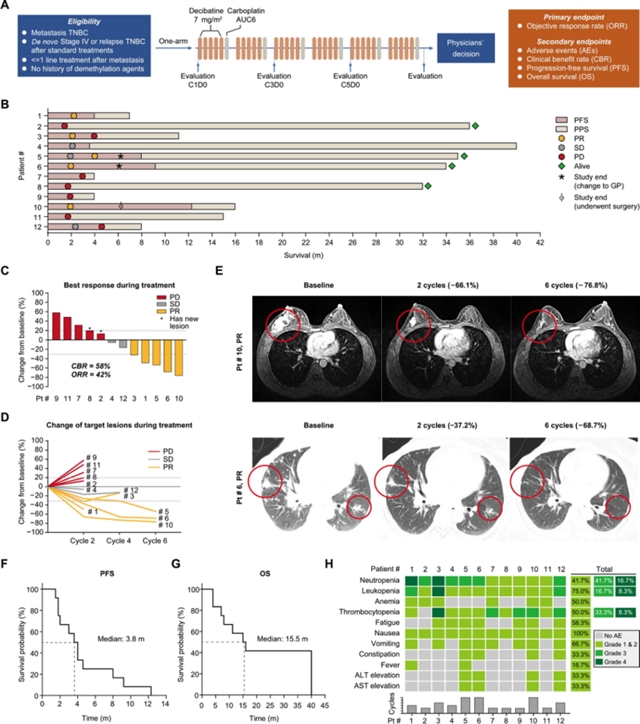 基于回顾性发现,团队设计了DETECT试验(NCT03295552),纳入12例IV期三阴性乳腺癌患者,采用地西他滨联合卡铂每3周治疗6周期。结果显示,该方案的客观缓解率为42%,临床获益率为58%,其中2例患者靶病灶缩小超过68%(图2)。在9例可进行TP53测序的患者中,6例p53突变患者的客观缓解率显著高于3例野生型患者,且中位总生存期更长。安全性方面,主要不良反应为血液学毒性,但可通过粒细胞集落刺激因子缓解。
