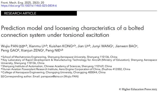 Wujiu PAN(潘五九), Xianmu LI(李先沐), Kuishan KONG(孔奎善), Jian LI(李健), Junyi WANG(王军义), Jianwen BAO(鲍建文), Peng GAO(高鹏), Xianjun ZENG(曾宪君), Peng NIE(聂鹏). Prediction model and loosening characteristics of a bolted connection system under torsional excitation. Front. Mech. Eng., 2025, 20(3): 20