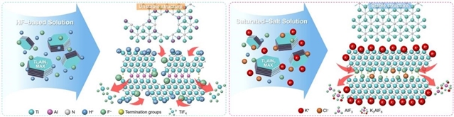 Ti4AlN3(s) + 6KF(s) + 3HCl(l) → Ti4N3Tx(s) + K3AlF6(s) + 3KCl(s) + 3/2H2(g)