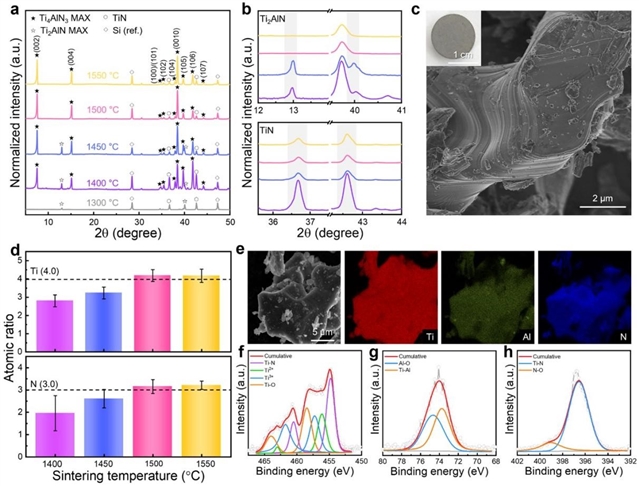 图1. Ti4AlN3 MAX相的合成。(a)在1300–1550 ℃温度范围内合成的Ti4AlN3 MAX相的XRD图谱;(b)放大的XRD图谱;(c)烧结后Ti4AlN3 MAX块体的SEM图像,插图为1500 ℃合成Ti4AlN3 MAX相的宏观形貌光学照片;(d)在Al含量固定为1.0的条件下,Ti/N原子比随烧结温度的变化关系;(e)1500 ℃合成Ti4AlN3 MAX相的元素分布图;(f–h)1500 ℃合成Ti4AlN3 MAX相的XPS谱图
