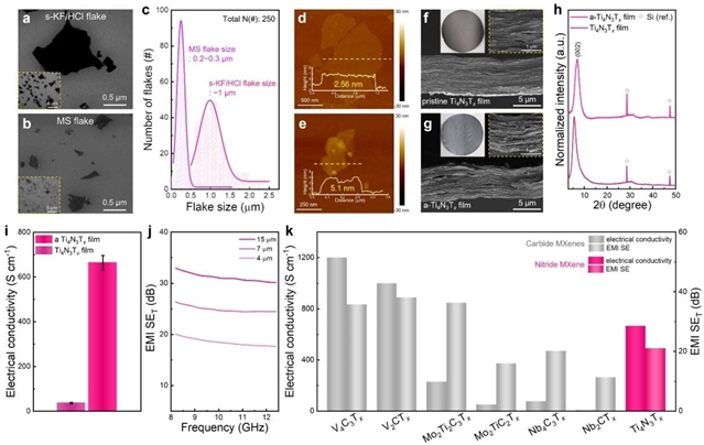 图4. 剥离二维Ti4N3Tx MXene的性能。通过(a)s-KF/HCl刻蚀和(b)MS刻蚀得到的剥离二维Ti4N3Tx MXene薄片的SEM图像;(c)MS刻蚀和s-KF/HCl刻蚀处理的Ti4N3Tx MXene薄片横向尺寸分布;(d)s-KF/HCl刻蚀和(e)MS刻蚀得到的剥离二维Ti4N3Tx MXene薄片的AFM图像;(f,g)原始和退火处理后Ti4N3Tx薄膜的截面SEM图像,插图为自支撑薄膜的光学图像和放大截面SEM图像;(h)原始与退火后Ti4N3Tx薄膜的XRD图谱;(i)退火前后Ti4N3Tx薄膜的电导率;(j)不同厚度退火Ti4N3Tx薄膜在X波段(8.2–12.4 GHz)的电磁干扰屏蔽效能;(k)使用Li+或TMA+作为插层离子合成的各种MXene薄膜的电导率与平均电磁干扰屏蔽效能