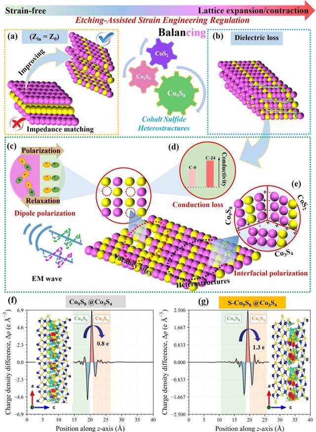 图6. 电磁波吸收机制分析。基于蚀刻辅助应变工程的多相缺陷Co9S8@Co3S4@CoS2异质界面中微波吸收机制示意图:(a)阻抗匹配吸收机制,(b)介电损耗吸收机制;对应极化模型:(c)偶极极化,(d)导电损耗,(e)界面极化。(f) Co9S8@Co3S4与(g) S-Co9S8@Co3S4异质界面沿Z方向的平面平均电荷密度差Δρ(z)。
