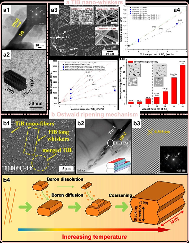 图2. (a)TiB纳米晶须:(a1–a2)TEM图像,(a3–a6)长径比与弹性模量、屈服强度以及强化效率的定量关系。(b)奥斯瓦尔德熟化机制。