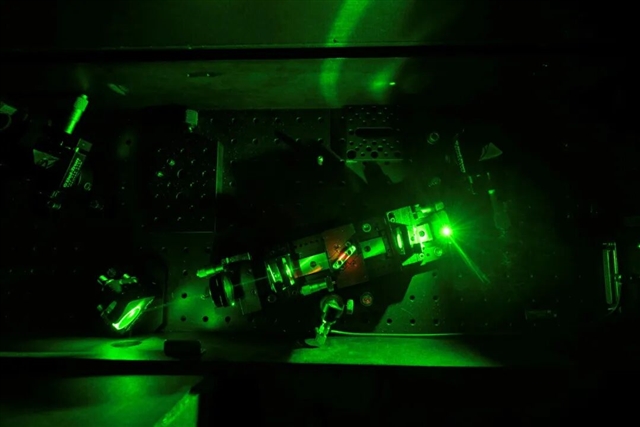 精准脉冲:郭春雷使用激光产生超快激光脉冲,在金属表面刻蚀纳米结构,从而制备高效STEGs。(罗切斯特大学照片 / J. Adam Fenster)