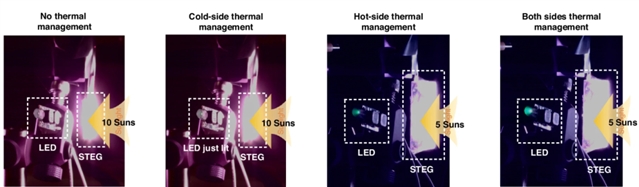 不同热管理策略的STEG驱动LED效果对比。从左到右依次为:无热管理、仅冷端热管理、仅热端热管理、以及双端热管理的效果。(来源:Light: Science & Applications)