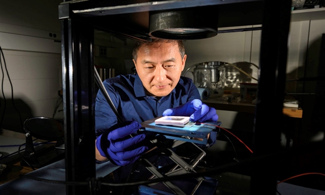 黑色金属助推器:罗切斯特大学郭春雷教授测试了一种通过飞秒激光脉冲刻蚀的太阳能热电发电器(STEG),以提升太阳能吸收和效率。他实验室的创新黑色金属技术设计使STEG的效率是以往设备的15倍,为新型可再生能源技术铺平了道路。(罗切斯特大学照片 / J. Adam Fenster)