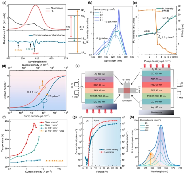 为了达到粒子数反转状态(产生激光的必要条件),需要给量子点注入足够大的电流,大电流密度下工作会产生巨大的焦耳热,常规器件(图1e,左)最高温度可飙升至470 K(图1f,红线),导致器件过热失效。面对这一问题,研究团队从空间、结构和时间方面三管齐下对器件进行热量管理。在空间上,将发光面积缩小到仅0.01 mm2,极大减少发热;在结构上,直接在散热优异的硅(Si)散热片上制作器件,快速导走热量;在时间上,使用超短脉冲(63 ns)电流驱动,避免热量累积。通过以上三方面的调控,器件在低温下(153 K)可稳定承受高达2000 A cm-2的惊人电流密度(图1g)。 电致发光光谱中清晰地观察到了来自CQDs高能级(1P)的强发光(图1h),证明了粒子数反转的实现(通过计算,平均每个量子点容纳5-6个激子)。