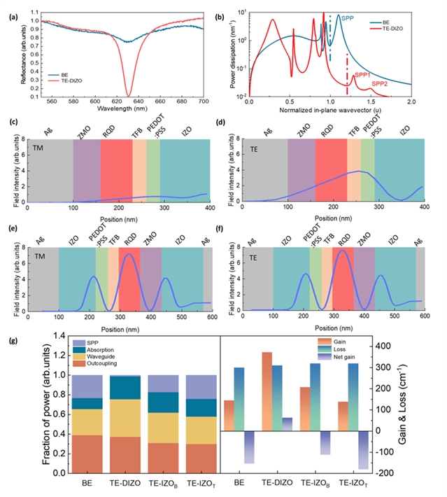 器件中金属电极会引发严重的光学损耗(吸收损耗、表面等离激元损耗),且表面发射结构需要半透明电极,会减弱光场限制。为了减少损耗,提高净增益,需要将光场最大限度地限制在CQDs增益区域内。为了解决这一问题,器件采用顶发射(TE)法布里-珀罗(FP)腔结构(图1e,右侧),使用银(Ag)和氧化铟锌(IZO)复合层作为电极(Ag/IZO底部反射电极及IZO/Ag顶部半透明电极)。通过对该新型的器件结构进行了详细的光学分析,发现所引入的厚IZO层几乎完全消除了金属Ag电极引起的SPP光损耗(图2b),并且IZO作为相位调节层,使光场主要局域在CQDs增益区域内(图2e-f)。这种结构的光场限制因子高达0.54,是传统底发射(BE)器件的两倍以上,使该新型器件结构呈现出了正的净光学增益,这是产生ASE的关键。这种结构中光场的强局域最大限度的提高了光与CQDs增益介质的相互作用,使器件在横向上产生了较强的ASE信号。横向ASE信号通过CQDs层的有效散射,最终从垂直方向出射,形成能够探测的表面出射ASE。