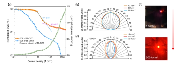 图4展示了器件在ASE区域具有减弱的效率滚降(图4a),证明大电流密度下器件的发光有放大现象。并且具有优异的发射方向性(图4c),远胜于传统底发射器件。实物照片直观显示了器件的高亮度定向发光(图4d)。