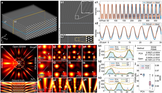 为评估PCA-3DSIM在复杂成像条件下的稳健性,研究人员通过在理想三维结构光照明场中引入逐像素波矢偏移及层间轴向位移,以模拟实际成像过程中的空间照明参数扰动(图1a-1c)。在此基础上,分别采用PCA-3DSIM与先进的开源重建框架Open-3DSIM6进行重建对比。仿真结果显示,由于Open-3DSIM依赖于全场一致的照明参数假设,其重建图像中存在一定程度的伪影。相比之下,PCA-3DSIM能够准确提取局部照明主成分,显著抑制伪影产生,重建图像在空间分辨率与结构保真度方面更接近于理想参考图(图1d-1j)。