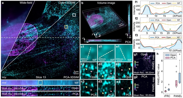 图2. 在自研系统下对HeLa细胞样本进行的超分辨成像对比实验。a-e 宽场图像与不同方法获得的超分辨图像;f 图c-e中沿黄色线的强度剖面图;g 特定层超分辨图像的PANEL评估对比图;h 不同方法获得的三维超分辨图像堆栈的PANEL值与rFRC值分布对比。