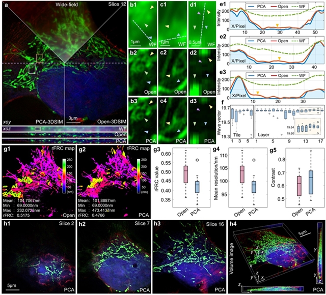 图3. 在Nikon N-SIM平台下对COS-7细胞样本进行的超分辨成像对比实验。a-d 宽场图像与不同方法获得的超分辨图像;e 图b-d中沿蓝色线的强度剖面图;f 特定层中沿x方向分块图像的横向波矢分布,以及某一横向位置在不同层中的波矢分布;g 特定层超分辨图像的rFRC图及三维图像堆栈的rFRC值分布、平均分辨率分布与对比度分布;h PCA-3DSIM获得的不同层超分辨图像切片及其整体三维视图。