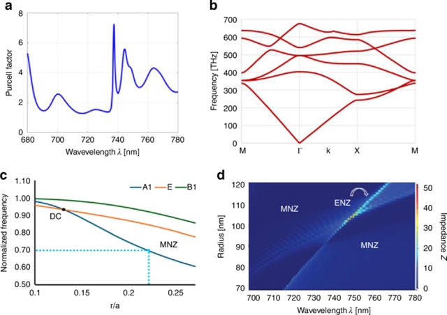 实验设计上,团队通过全波数值模拟优化 MNZ 结构参数,采用周期505nm、半径115 nm的金刚石柱阵列,在保持低阻抗的同时实现7 倍 Purcell 因子增强。该设计巧妙利用狄拉克锥色散特性,通过调节柱子半径打破模式简并,在布里渊区