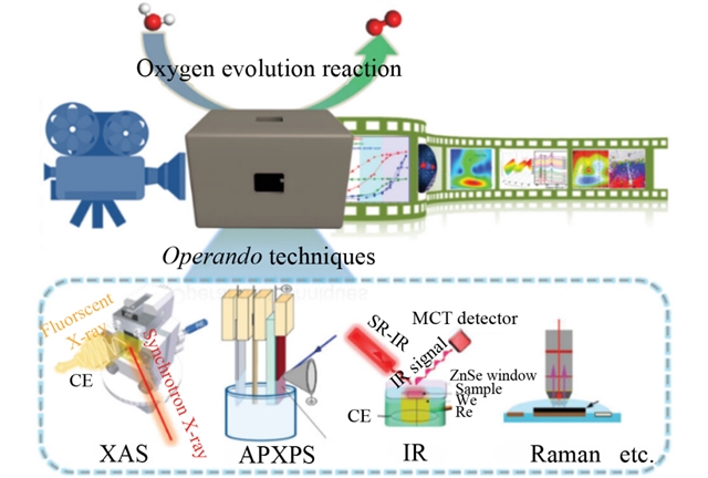 为揭示表面重构的动态机制,原位/工况表征技术的发展具有重要意义。原位技术通过模拟反应环境研究准静态结构,而工况技术则在真实反应条件下同步监测催化性能,直接关联结构动态与功能指标。例如,X射线吸收光谱(XAS)可分为近边结构(XANES)和扩展边结构(EXAFS),分别提供电子结构和局部配位环境信息。操作XAS已用于捕捉TMCs在OER过程中的价态变化与配位几何重构,如低结晶度钴硫化物在碱性条件下生成高氧化态钴物种作为OER活性中间体。