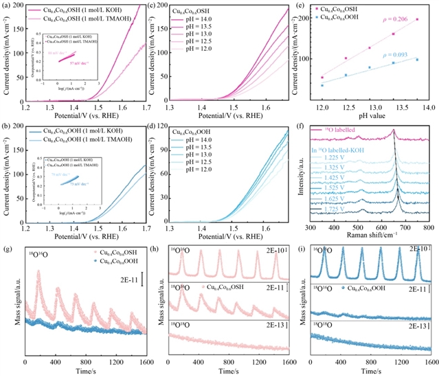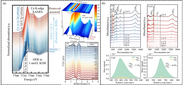 拉曼光谱凭借对水的弱散射特性及低波数振动的高灵敏度,成为探测固液界面动态的重要工具。例如,镍硫化物在阳极活化时,原始相的特征峰逐渐被羟基氧化镍的金属-氧振动峰取代,证实了羟基氧化物的形成。此外,衰减全反射红外光谱结合差分电化学质谱及同位素标记技术,揭示了相同成分催化剂的重构差异:一种铜硫化物因金属离子更易氧化,生成反应中间体的能力强于另一种铜硫化物,且其特定配位结构优化了电子传导与动态重构效率。