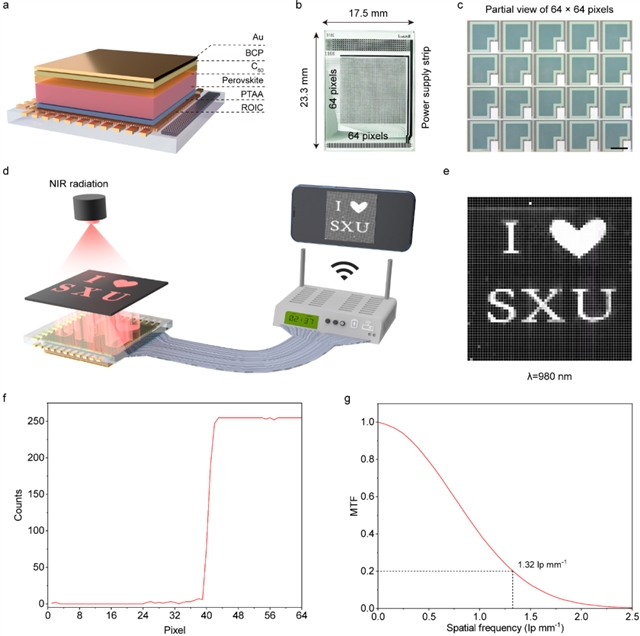最后,基于已构建的钙钛矿近红外光电探测器,通过与商用TFT读出电路单片集成,实现了钙钛矿近红外成像芯片,芯片在980 nm辐射下,对典型图案“I ♥ SXU”清晰成像,其空间分辨率达到1.32 线对/毫米。