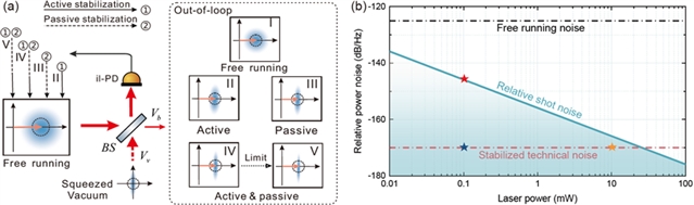 图1: (a) 产生明亮压缩光的策略 (b) 技术噪声和散粒噪声对比。