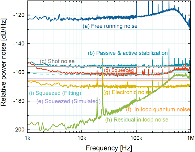 实验中,将研究团队发展的二次谐波产生(second harmonic generation,SHG)过程宽带被动功率稳定与高环路增益的主动功率稳定技术有机结合,构建了环路增益高达 80 dB 的新型双级混合式功率噪声抑制系统,大幅降低了主动反馈环路对高增益的依赖,成功地将反馈环路带宽拓展至 MHz频段。该方案将激光在 kHz 频段的技术噪声从 –122 dB/Hz 降至 –165 dB/Hz,比 1 mW 光功率对应的散粒噪声低 9 dB,最终实现了 –5.5 dB、1 mW、kHz–MHz的高压缩度、大带宽明亮振幅压缩光输出,如图3所示。实验结果与理论预测结论一致,验证了该方案的可行性与有效性。此外,被动稳定的光束来自于倍频腔反射的基频光,属于压缩光制备单元的一部分,无需额外激光功率,从而显著提高了功率利用效率和系统集成度。