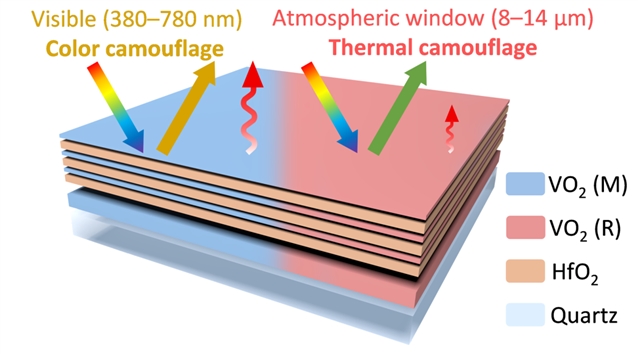 伪装技术依托于与环境背景的高效融合,能够显著降低目标的可探测性,从而有效增强其隐蔽性能。随着探测技术的持续发展,传统伪装技术面临着新的挑战,尤其当目标处于多变的环境中和复杂的运行条件时,其效果更易受限。如今,可见光探测与热成像探测技术的广泛应用对目标隐蔽性提出了更高要求,因此,发展高效的可见光及红外伪装技术对于降低目标可探测性具有重要意义。因此,面向性能动态可调的多光谱伪装技术的探索具有重要的研究价值。