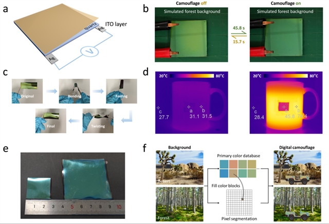 图3. (a) 器件实现焦耳加热主动控制的示意图;(b) 电压控制多光谱动态调制器开关的照片;(c) 柔性多光谱动态调制器机械处理的照片;(d) 将热水倒入覆盖有柔性多光谱动态调制器的杯子前后的红外图像;(e) 不同尺寸的柔性多光谱动态调制器;(f) 数码迷彩生成算法系统示意图。