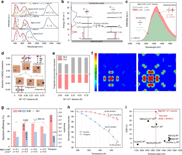 图2. MgO:Ni2+,Cr3+半透明陶瓷的发光特性。a) MgO:0.3%Ni2+,0.3%Cr3+、MgO:0.3%Ni2+及MgO:0.3%Cr3+陶瓷的激发光谱(PLE)与发射光谱(PL)。b) MgO:0.3%Ni2+,0.3%Cr3+陶瓷中Cr3+/Ni2+能级图及Cr3+向Ni2+能量传递机制。c) MgO:0.3%Ni2+与MgO:0.3%Ni2+,0.3%Cr3+陶瓷中八面体阳离子位点Ni2+的NIR-II发射光谱对比。d) MgO:Ni2+与MgO:Ni2+,Cr3+陶瓷中[NiO6]在不同Ni2+-Cr3+距离下的八面体畸变结构。插图展示了MgO:Ni2+与MgO:Ni2+,Cr3+中[NiO6]八面体的局部结构。e)在不同Ni2+-Cr3+距离下 O-2p和Ni-3d轨道对最高占据3d Kohn-Sham轨道的贡献的函数。f)单个Ni2+掺杂剂(左)与间距为4.28Å的Ni2+-Cr3+掺杂剂(右)的带分解电荷密度分布。这些分布图展示了(0 6 0)米勒平面内Ni2+ 3d8 Kohn-Sham轨道,饱和尺度从0.0001(蓝色)到0.002(红色),等值线间隔为0.01至0.3,其中a0为玻尔半径。g) MgO:0.3%Ni2+,0.3%Cr3+(x = 0.1-0.7)陶瓷与MgO:0.3%Ni2+,0.3%Cr3+荧光粉的吸收(虚线)、内量子效率(红柱)及外量子效率(蓝柱)。h) MgO:0.3%Ni2+,0.3%Cr3+陶瓷与荧光粉的积分发光强度随温度变化趋势。i) MgO:0.3%Ni2+,0.3%Cr3+陶瓷与此前报道的Ni2+激活NIR-II荧光粉的EQE值对比。