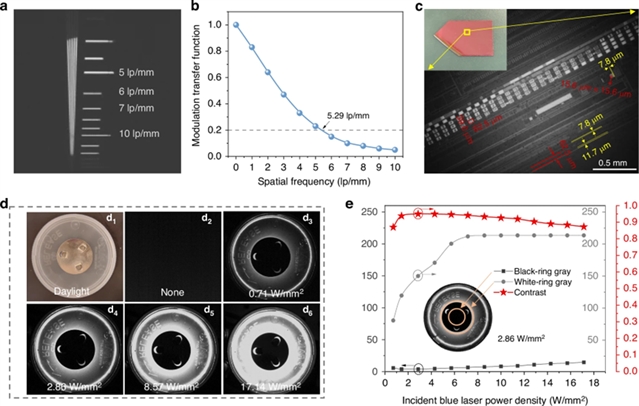 图4. 基于激光驱动的NIR-II光源的应用。a) 采用MgO:0.3%Ni2+,0.3%Cr3+陶瓷制备的激光驱动近红外II光源空间分辨率,通过标准线对卡测定。b) 基于MgO:0.3%Ni2+,0.3%Cr3+陶瓷的激光驱动近红外II光源调制传递函数曲线。 c) 商业硅片内部集成微结构照片:左上角插图为日光下可见光相机拍摄,其余为近红外相机在所得近红外II光源下拍摄。d) 塑料盒上铁片的摄影:日光下可见光相机拍摄(d1),暗室中红外相机拍摄(d2),不同蓝光激光功率密度下本NIR-II光源照射效果(d3-d6)。e) 塑料盒白色环(实点线)与铁片黑色环(实方线)的近红外图像灰度变化趋势,以及白色/黑色环近红外图像的对比度变化趋势(实星线)。插图为在2.86 W/mm2激发条件下塑料盒上铁片的NIR图像。