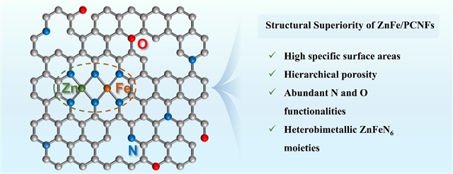 本研究系统揭示了从PCNFs到Zn/PCNFs再到ZnFe/PCNFs的结构演化规律及其性能提升机制。三种材料均具备高比表面积与分级孔结构,为离子吸附提供了物理基础;然而,PCNFs仅依赖随机分布的N/O官能团,活性位点有限;Zn/PCNFs中的ZnN4单金属位点增强了离子吸附,性能显著提升;而ZnFe/PCNFs中的ZnFeN6双金属位点通过电子耦合效应实现电荷离域与电子密度重分布,显著强化Zn2+和CF3SO3-的协同吸附能力。这一由“无金属到单金属再到双金属”的结构优化过程实现了容量、动力学与稳定性的协同提升,充分验证了双金属原子配位工程在突破碳基电极储能瓶颈中的有效性,并为多体系储能材料设计提供了可推广的设计思路。