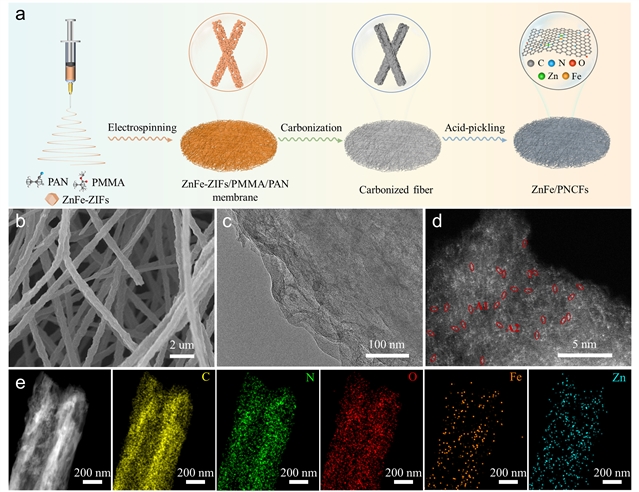 图1.(a)ZnFe/PCNFs的制备示意图;(b)ZnFe/PCNFs的扫描电子显微镜(SEM)图像;(c)ZnFe/PCNFs的透射电子显微镜(TEM)图像;(d)ZnFe/PCNFs的高角环形暗场扫描透射电子显微镜(HAADF-STEM)图像;(e)ZnFe/PCNFs的STEM图像及其对应的C、N、O、Fe和Zn元素分布图。