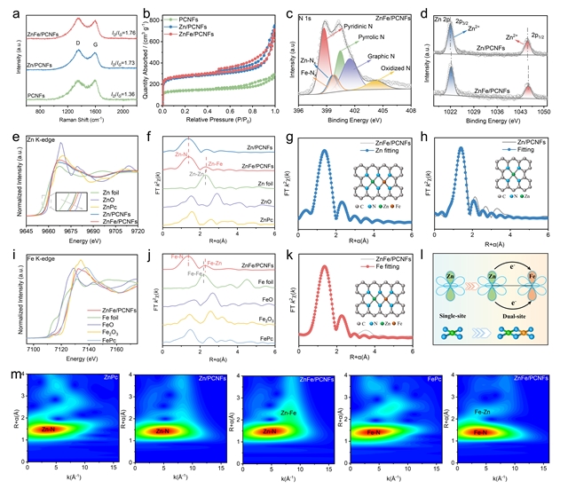 图2.(a)ZnFe/PCNFs、Zn/PCNFs和PCNFs的拉曼光谱;(b)ZnFe/PCNFs、Zn/PCNFs和PCNF 的氮气吸附-脱附等温线;(c)ZnFe/PCNFs的N 1s XPS光谱;(d)Zn/PCNFs与ZnFe/PCNFs的Zn 2p XPS光谱;(e)ZnFe/PCNFs在Zn K边的XANES光谱;(f)ZnFe/PCNFs在Zn K边的EXAFS光谱;(g)ZnFe/PCNFs和(h)Zn/PCNFs在Zn K边的傅里叶变换EXAFS(FT-EXAFS)拟合曲线;(i)ZnFe/PCNFs在Fe K边的XANES光谱;(j)ZnFe/PCNFs在Fe K边的EXAFS光谱;(k)ZnFe/PCNFs在Fe K边的FT-EXAFS拟合曲线;(l)电子效应关系示意图;(m)EXAFS光谱的小波变换结果。