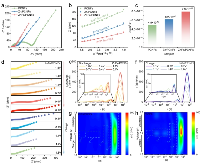 图4.(a)ZnFe/PCNFs、Zn/PCNFs和PCNFs的Nyquist图;(b)Z′与ω-1/2之间的关系;(c)离子扩散系数比较;(d)ZnFe/PCNFs在原位电化学阻抗谱(EIS)测试过程中的Nyquist图;(e, f)ZnFe/PCNFs在不同电位下基于EIS数据计算得到的分布电阻谱(DRT)结果;(g)ZnFe/PCNFs和(h)PCNFs的DRT等高线图。