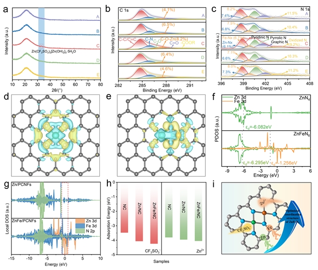 图5.(a)ZnFe/PCNFs正极在不同充放电状态下的非原位XRD图谱;高分辨(b)C 1s和(c)N 1s XPS光谱;(d)ZnN4与(e)ZnFeN6的差分电荷密度分布;(f)ZnN4与ZnFeN6的投影态密度(PDOS);(g)ZnN4与ZnFeN6中金属3d轨道与N 2p轨道的能级分布;(h)Zn2+和CF3SO3-在模型上的吸附能;(i)离子吸附机制示意图。