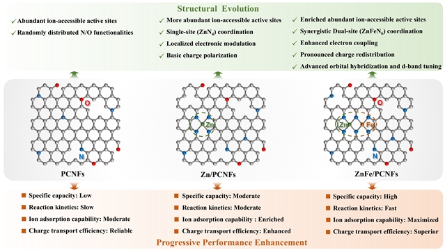 图6. 从PCNFs到Zn/PCNFs再到ZnFe/PCNFs的结构演化过程及电化学性能提升示意图。