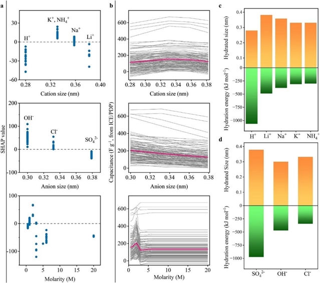图4. 阳离子尺寸、阴离子尺寸和摩尔浓度对电容的影响。(a)SHAP值分布图,(b)ICE-PDP曲线图,(c,d)阳离子、阴离子的水合能与离子尺寸的关系