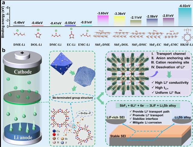 图1 理论计算和机制。(a)溶剂分子、SbF3以及HKSF与Li之间的结合能;(b)HKSF@PE功能界面层调控锂离子行为和重构高稳定LMBs负极界面的机制。