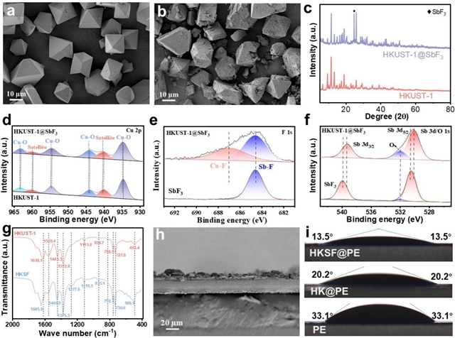 图2 功能材料及其功能化隔膜的物理化学特性表征。(a)HKUST-1和(b)HKSF的SEM图;(c)HKUST-1和HKSF的XRD图;(d)HKUST-1和HKSF的XPS Cu 2p精细谱; HKSF和SbF3的XPS(e)F 1s、(f)Sb 3d精细谱;(g)HKUST-1和HKSF的FT-IR图;(h)HKSF@PE的横截面SEM图;(i)HKSF@PE、HK@PE、PE隔膜与电解液的接触角测试。