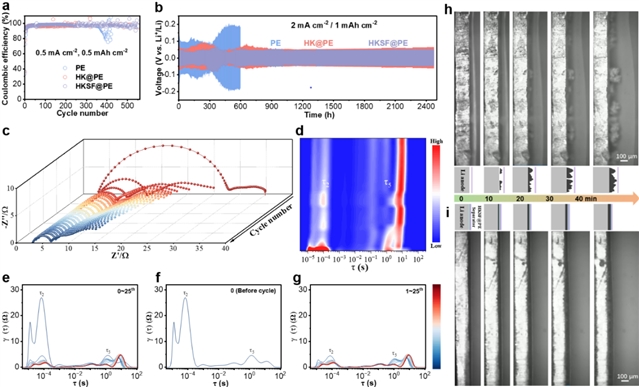 图4 基于不同隔膜的Li||Cu和Li||Li电池的电化学性能表征。(a)Li||Cu电池在0.5 mA cm-2,0.5 mAh cm-2条件下循环的库伦效率;(b)Li||Li对称电池在2 mA cm-2,1 mAh cm-2条件下循环的电压-时间曲线; Li|HKSF@PE|Li对称电池在不同循环圈数下的(c)原位EIS 及其对应的(d-g)DRT分析;(h)Li|PE|Li和(i)Li|HKSF@PE|Li对称电池在2 mA cm-2,1 mAh cm-2条件下的原位光学测试。