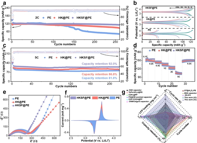本研究通过巧妙的材料设计,将MOF的结构优势与SbF3的界面重构功能结合,实现了锂金属电池性能的突破。其双功能机制不仅解决了离子传输动力学问题,还通过原位界面重构提升了锂金属负极的长循环稳定性,为高能量密度电池的开发提供了新技术。得益于此,Li|HKSF@PE|Li对称电池在2 mA cm-2下稳定运行超2500小时,Li|HKSF@PE|Cu电池在0.5 mA cm-2,0.5 mAh cm-2下即使循环560次,平均CE仍达97.5%,Li|HKSF@PE|LFP全电池在即使在5C高倍率下,历经220次循环后仍具有92.0%的高容量保持率。该工作为构建无枝晶、高可逆LMBs的功能界面层设计提供新思路,并展示了隔膜界面工程策略同时实现调控锂离子行为和重构SEI组成的广阔应用前景。