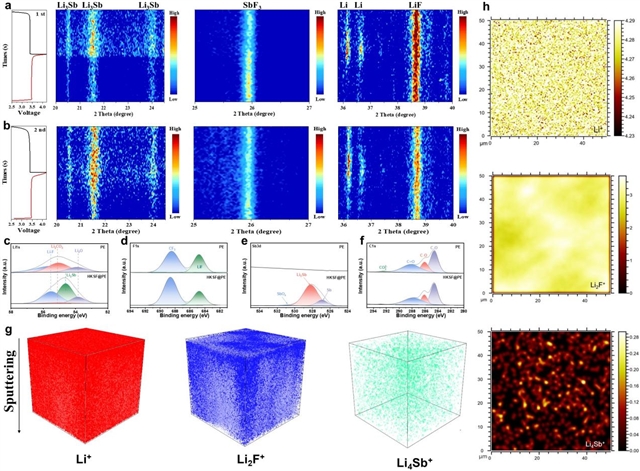 图6 负极界面信息表征。Li|HKSF@PE|LFP全电池在(a)第一次循环和(b)第二次循环时的原位XRD光谱;Li|HKSF@PE|Li和Li|PE|Li对称电池在2 mA cm-2,1 mAh cm-2条件下沉积/剥离500小时后负极界面的(c)F 1s,(d)Li 1s,(e)Sb 3d,(f)C 1s的XPS精细谱;Li|HKSF@PE|Li对称电池在2 mA cm-2,1 mAh cm-2条件下循环200次后锂负极界面SEI层的Li+(Li)、Li2F+(LiF)和Li4Sb+(Li3Sb)的ToF-SIMS(g)3D和(h)2D视图。