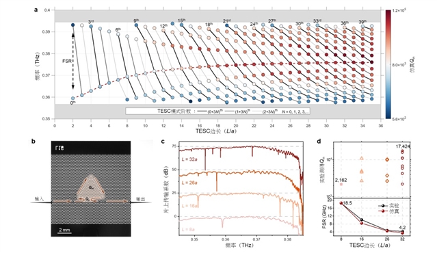 图2a展示了不同尺寸TESC所支持模式的本征谐振频率与Qin。随着TESC尺寸增大,拓扑带隙内可支持的谐振模式数量逐渐增多,Qin得到显著提升,而FSR随之减小。这一变化规律与传统微环谐振腔中回音廊模式(whispering gallery mode,WGM)的尺寸缩放规律一致。通过硅基刻蚀工艺制备的太赫兹频段TESC样品(图2b)进一步验证:随着TESC尺寸增大,实验测得的Qin从2,162提升至17,424,而FSR则从18.5 GHz减小至4.2 GHz。